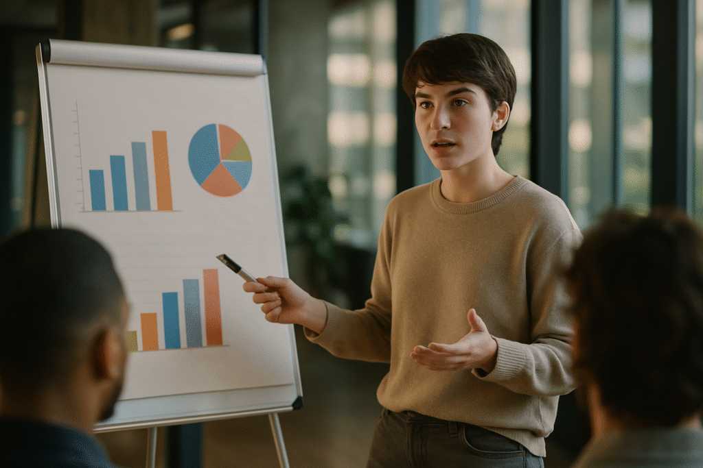 Jovem apresentando uma apresentação de negócios em um escritório moderno